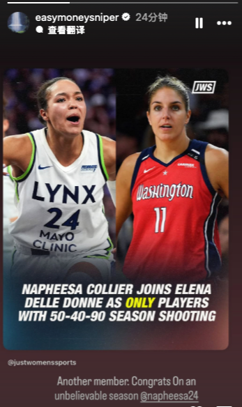 雷速体育9月12日讯 WNBA常规赛收官战,山猫72-53战胜女武神。本场比赛,山猫球员科利尔10投8中,三分球4投3中,极其高效地砍下19分4篮板2助攻2抢断。本场比赛过后,科利尔本赛季的投篮命中率为53.1%、三分命中率40.3%、罚球命中率90.6%,她也就此成为WNBA历史上第二...