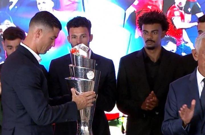 仪式上,C罗与国家队队友默哀,并现场拥抱了若塔的父亲表示慰问。C罗还代表国家队向全场展示了欧国联的冠军奖杯,这份由国家队集体赢得的荣誉,体现了对若塔卓越贡献的致敬与纪念。